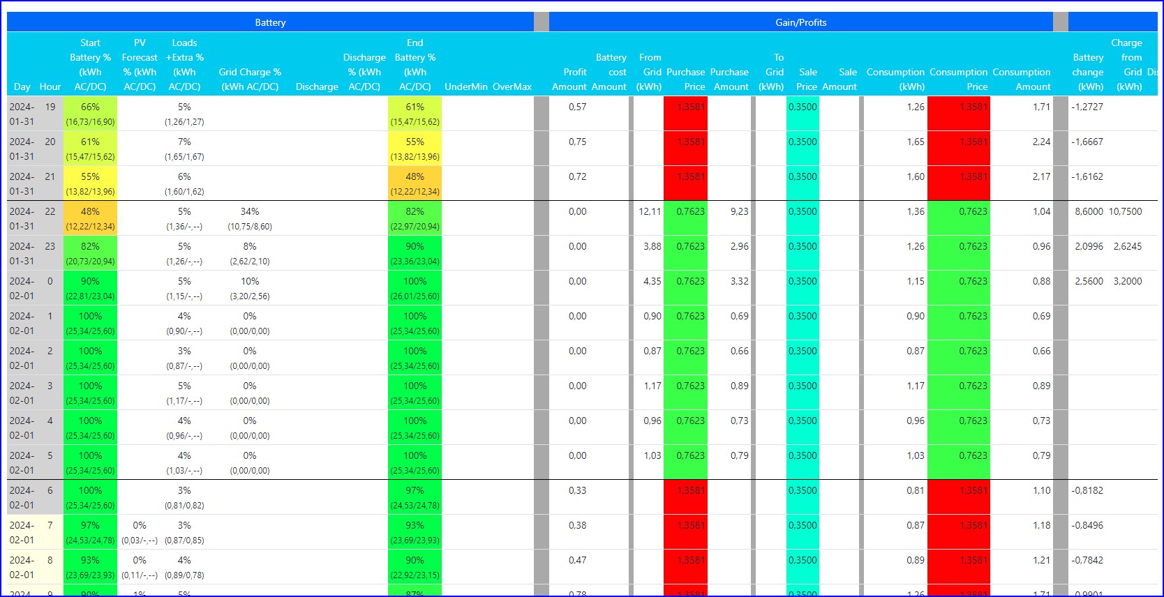- The second one try to discharge battery if during next 24h there will be too much power and/or charge battery if during next 24h you don't reach 100% (or other defined MaxSco). It can be joined with Dynamic Scheduler to move schedulers to cheapest prices or Dynamic Discharge to discharge on highest prices.