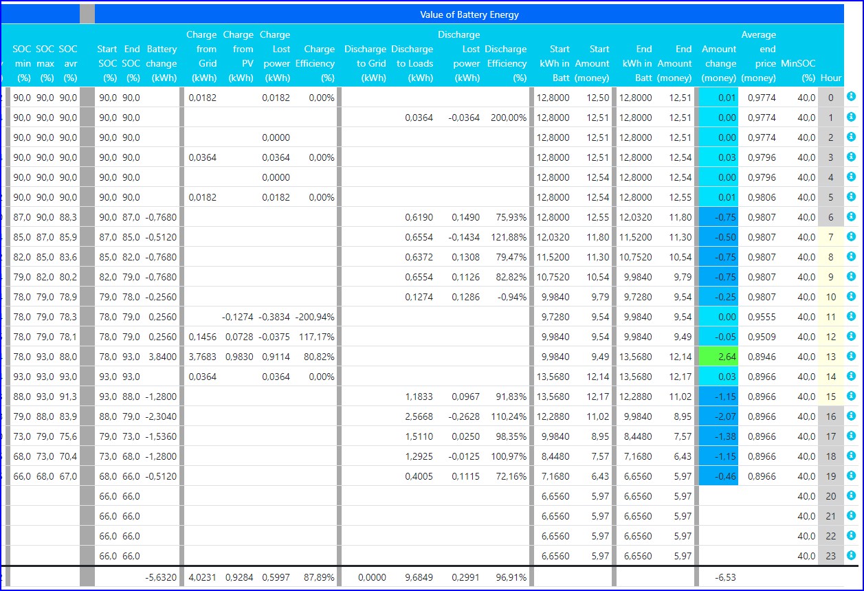 - Valuation of energy in the battery based on average purchase price (price only during charging from grid, charging from PV is free) and takes into account during optimalization